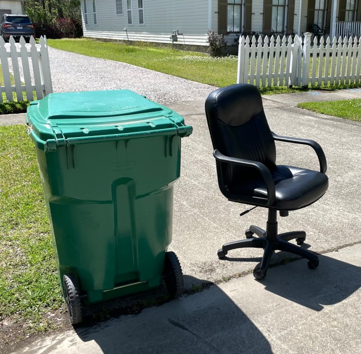 On one of our daily walks, we passed a dark brown leather office chair sitting at the curb for garbage pickup. I gave the chair a quick once over and rejected it, thinking either the height adjustment or one of the wheels was probably broken. When we passed the chair a second time, I tried it out. The chair was comfortable and everything worked, so I decided to roll it home.